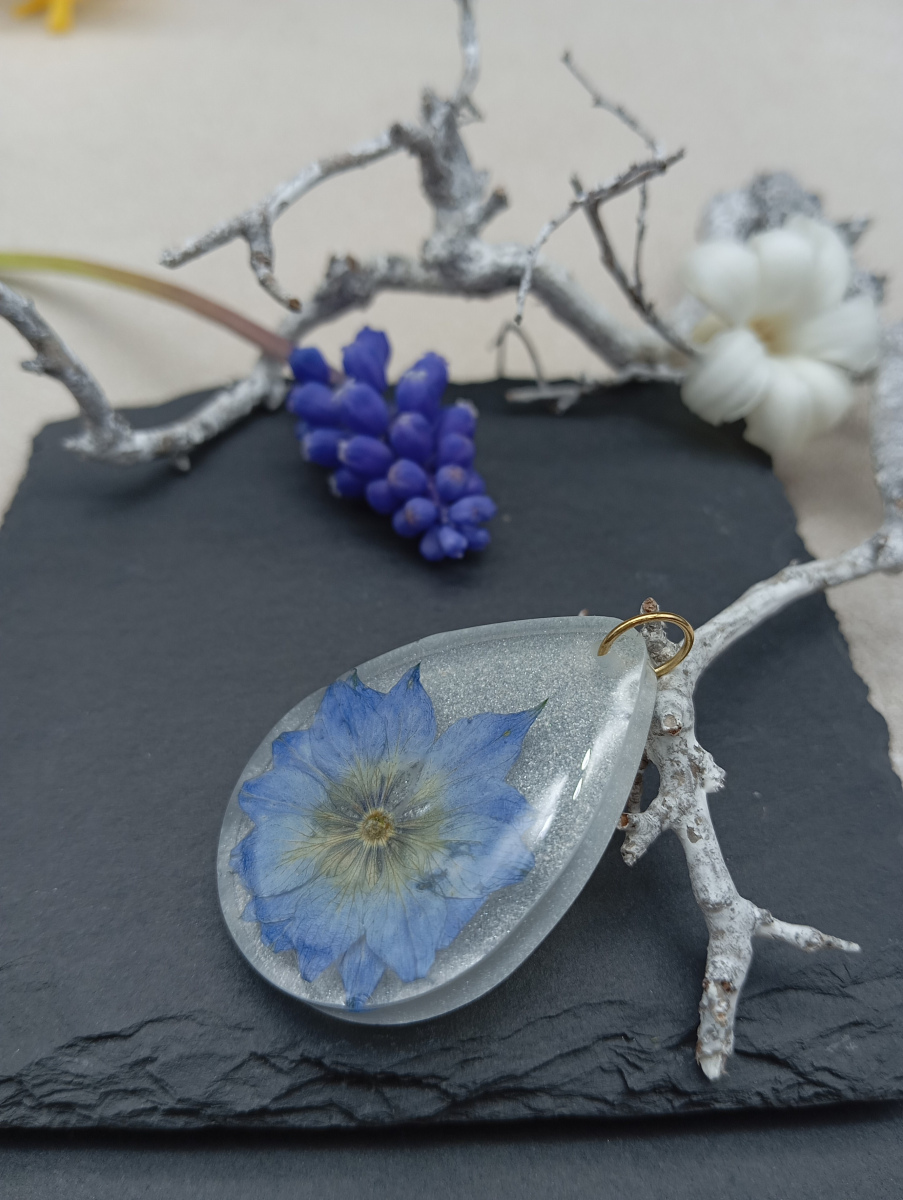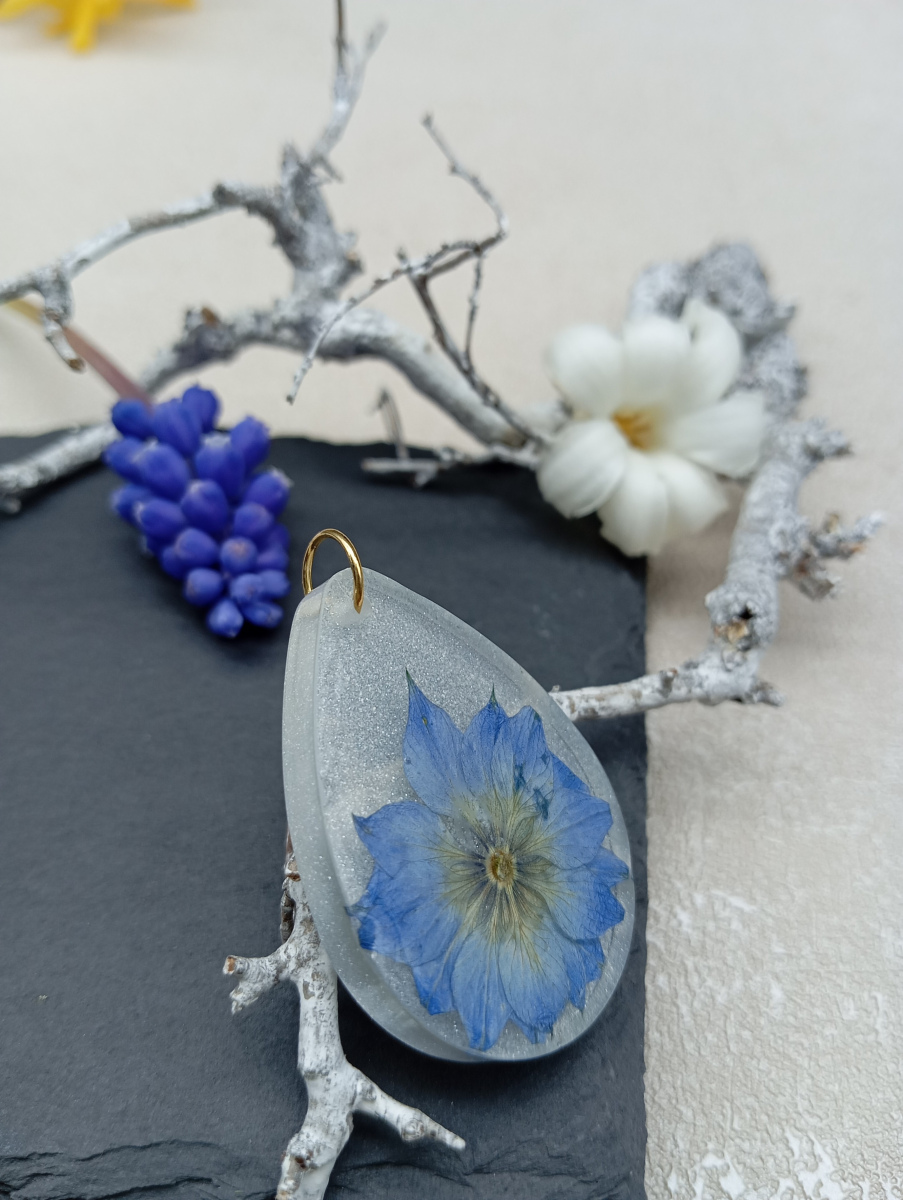 Pendentif: en forme de goutte, 4 sur 3 cm (épaisseur 5 mm), résine sur fond blanc nacré