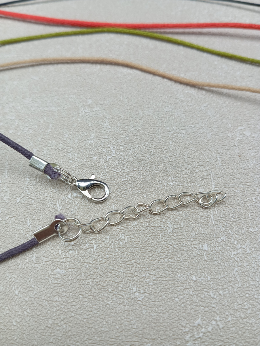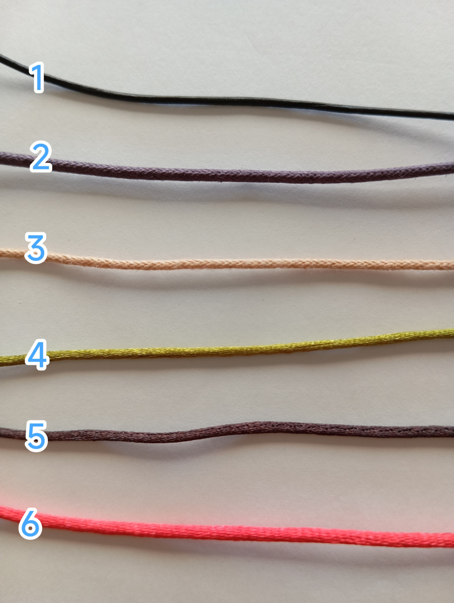 - Cordon 1: cuir 1 mm NOIR 2: coton ciré 1,5 mm AUBERGINE 3: coton ciré 1 mm BEIGE 4: nylon 1.5 mm VERT 5: nylon 1.5 mm CAFE 6: nylon 2 mm ROUGE