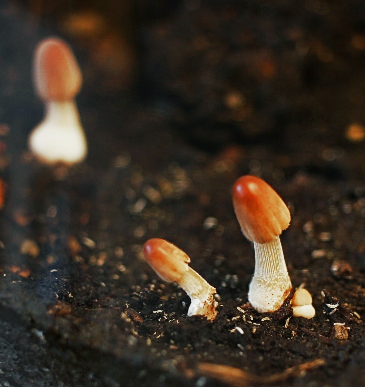 Photo prise dans un de mes terrariums où vous pouvez voir de petits champignons entrain d'éclore ainsi qu'une belle famille de collemboles à leurs pieds.